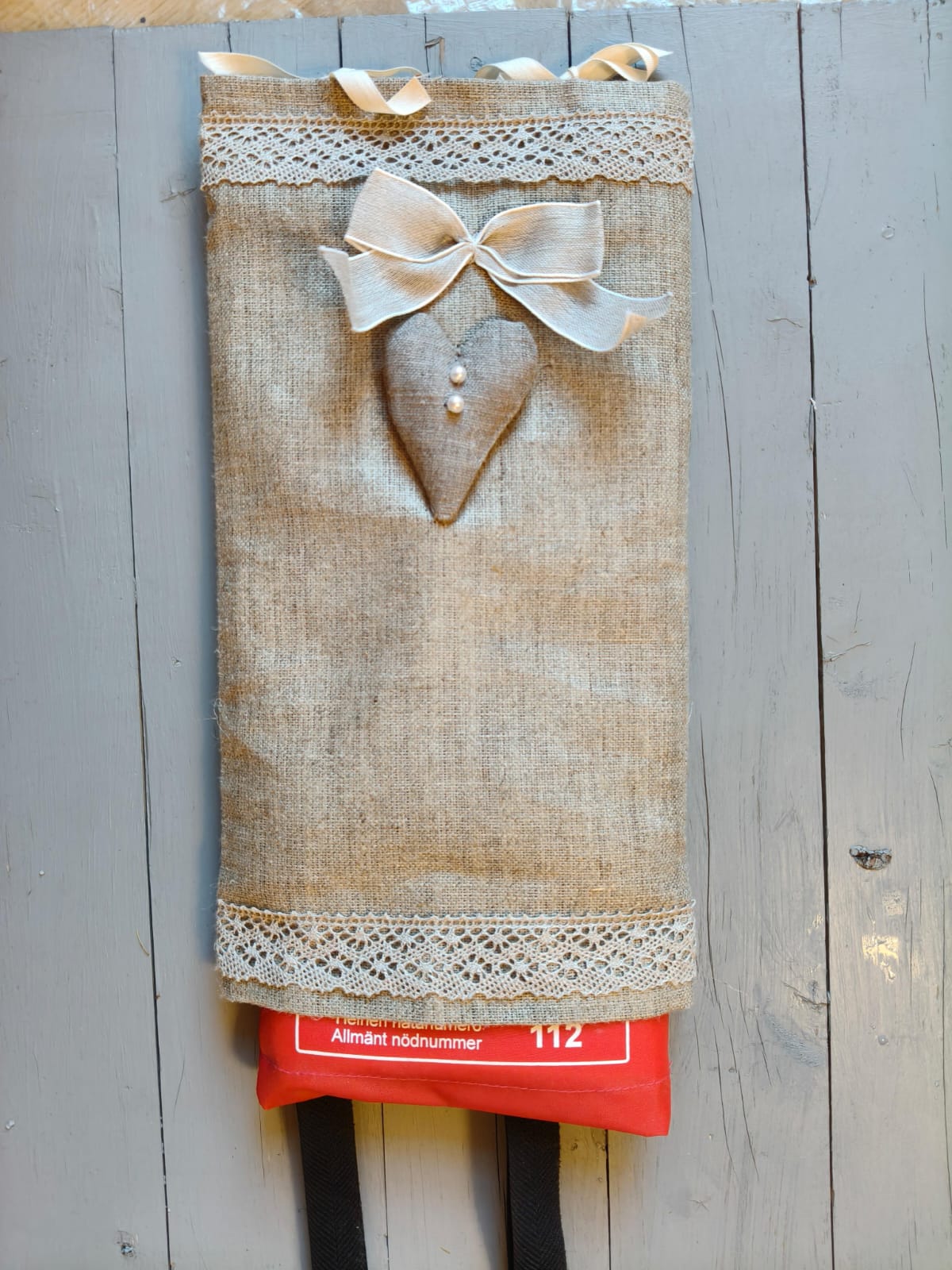 Pellavainen sammutuspeitteen suojus. Pitsi ja sydän somisteet.